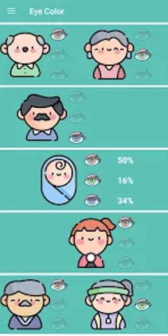 Baby Eye Color Predictor is een gebruiksvriendelijke app voor Android die ouders helpt de waarschijnlijkheid van de oogkleur van hun baby te voorspellen. Gebruikers kunnen eenvoudig de oogkleur van de grootouders, moeder en vader instellen door op de ogen te tikken. De app biedt een intuïtieve interface waarbij de resultaten zijn gebaseerd op genetische gegevens die online beschikbaar zijn. Het is mogelijk om verschillende combinaties van oogkleuren in te voeren en te ontdekken welke kleur het meest waarschijnlijk is, zoals hazel, groen of blauw.